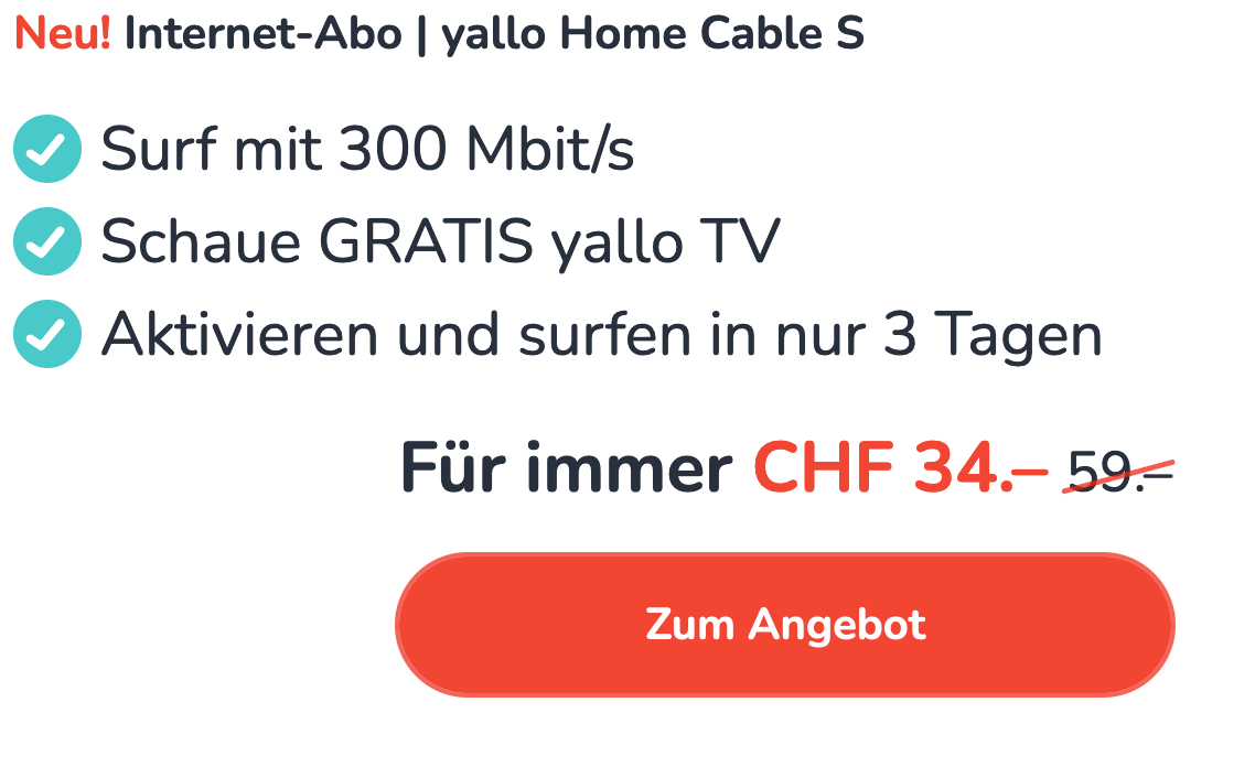 Yallo Home Cable S ist derzeit für CHF 34.- anstatt 59.- erhältlich. Das Internet-Abo mit 300 Mbit/s enthält zudem yallo TV mit 7 Tagen Replay und eine TV-Box. Dieses Angebot erfordert einen TV-Kabelanschluss von UPC.