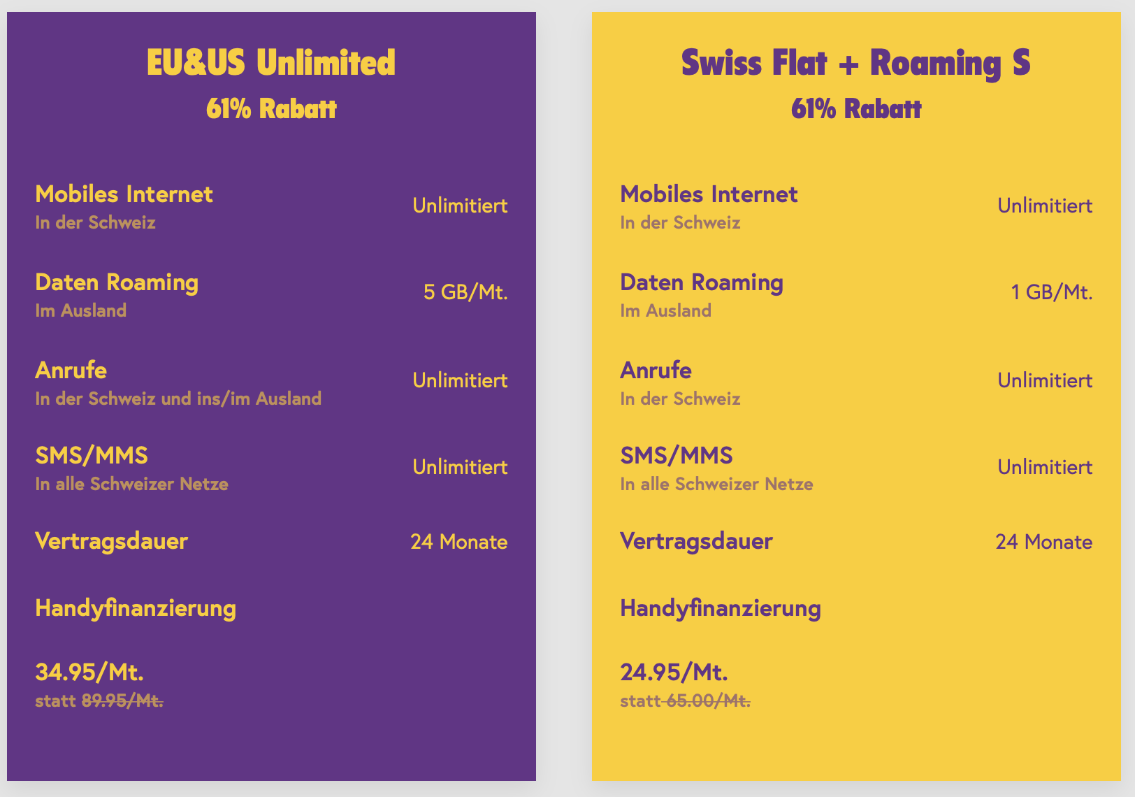 Wichtiger Hinweis: Obwohl bei einigen Abos «Unlimitiertes mobiles Internet in der Schweiz» steht, ist das Highspeed-Datenvolumen innerhalb der Schweiz auf 40 GB, resp. neu auf 60 GB pro Monat begrenzt. Danach wird die Geschwindigkeit auf kaum nützliche 0.032 Mbit/s gedrosselt. Alternativ stehen weitere Datenpakete mit z.B. 1 GB für CHF 12.- zur Verfügung.