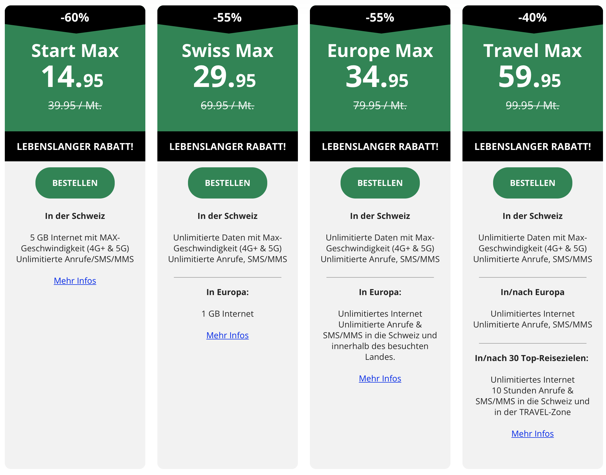 Das Salt Handy-Abo «Start Max» ist derzeit für CHF 14.95 anstatt 39.95, das «Swiss Max» für CHF 29.95 anstatt 69.-, das «Europe Max» für CHF 34.95 anstatt 79.95 und das «Travel Max» für CHF 59.95 anstatt 99.95 erhältlich. Der Aktionspreis gilt so lange, wie das Abo behalten wird.
