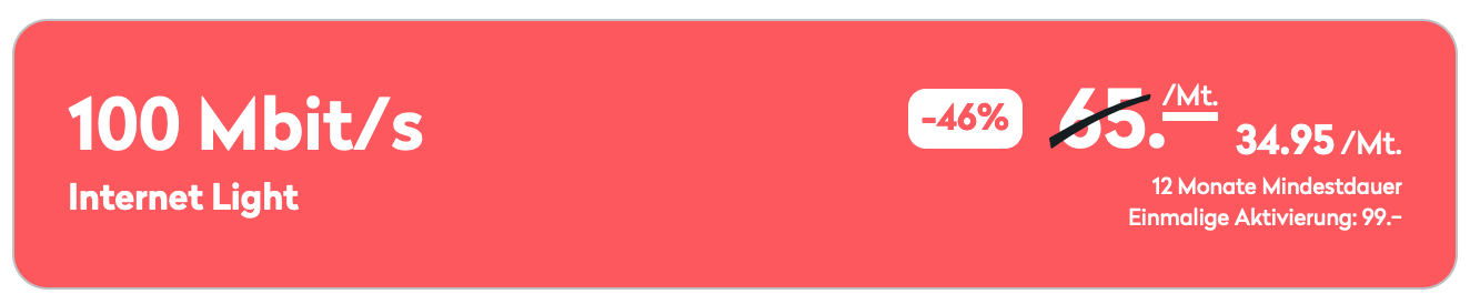Das Wingo Internet-Abo «Light» mit bis zu 100 Mbit/s ist derzeit für CHF 34.95 anstatt 65.- erhältlich. Der Aktionsrabatt gilt lebenslang. Für dieses Angebot gilt die Mindestvertragsdauer von 12 Monaten, die Kündigungsfrist beträgt 2 Monate.