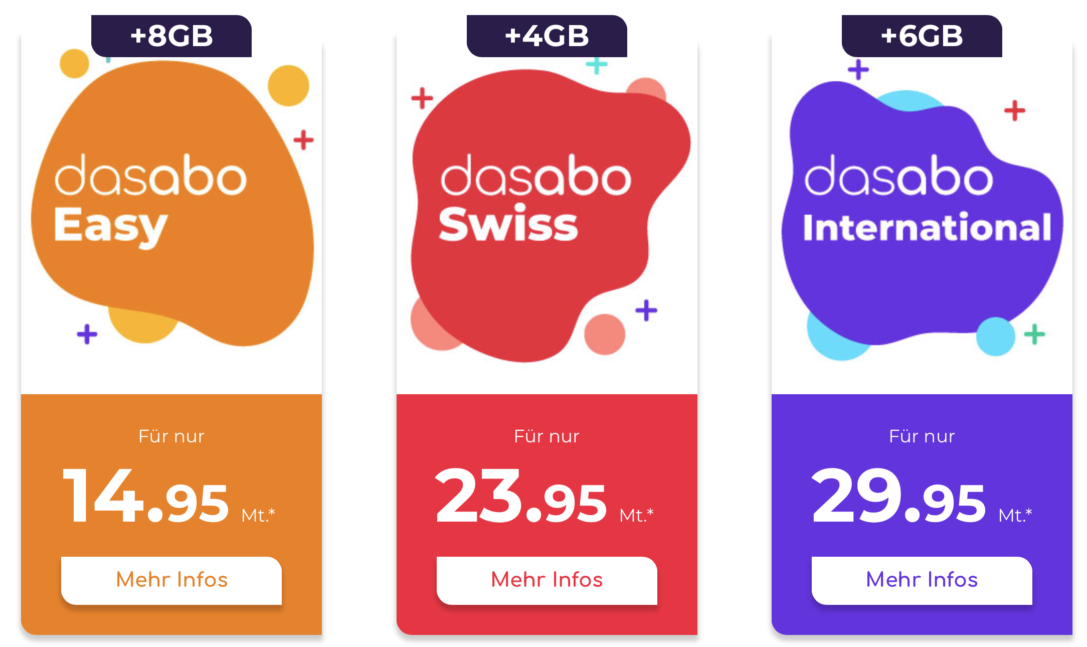 Die drei Abos von «Das Abo» enthalten derzeit mehr Datenvolumen. Das Abo Easy enthält 8 anstatt 4 GB für die Schweiz, Swiss 4 GB und International 6 GB für Roaming. Swiss und International sind zudem günstiger. Die Konditionen und der Preis sollte ohne Beschränkung gültig sein. Es gilt keine Mindestvertragsdauer, die Kündigungsfrist beträgt 60 Tage. Die einmaligen Aufschaltkosten betragen CHF 59.95.