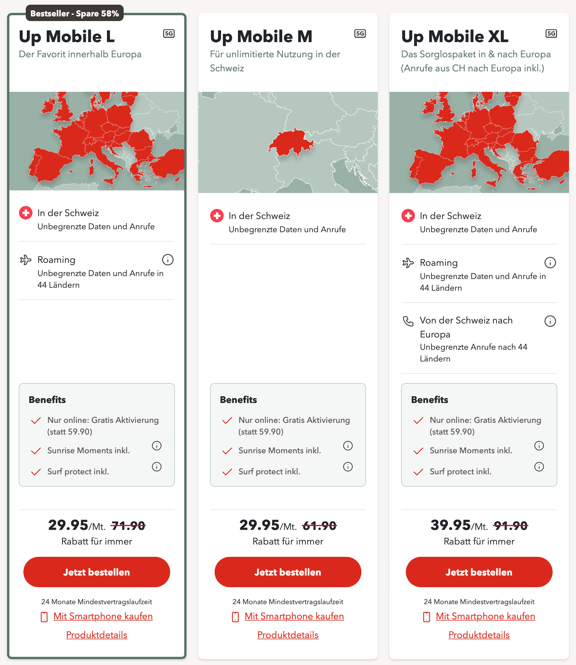 So ist das Sunrise Handy-Abo «Up Mobile M» und «Up Mobile L» zum Aktionspreis von CHF 29.95 anstatt 61.90, resp. 71.95 und das «Up Mobile XL» für CHF 39.95 anstatt 71.90 erhältlich. Die Mindestvertragsdauer für diesen Black Friday-Deal beträgt 24 Monate.