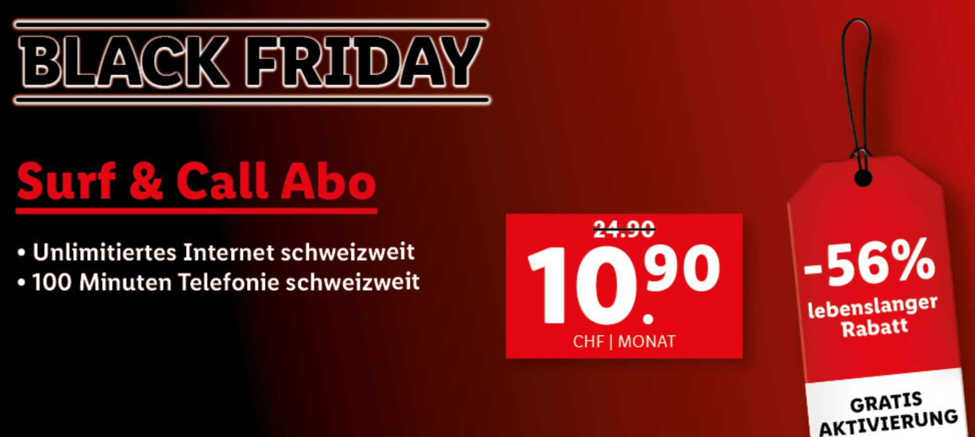 Zum Black Friday 2024 ist das Lidl Connect Handy-Abo «Surf & Call» zum Aktionspreis von CHF 10.90 anstatt 24.90 erhältlich. Der Aktionsrabatt soll gemäss Webseite lebenslang gelten.