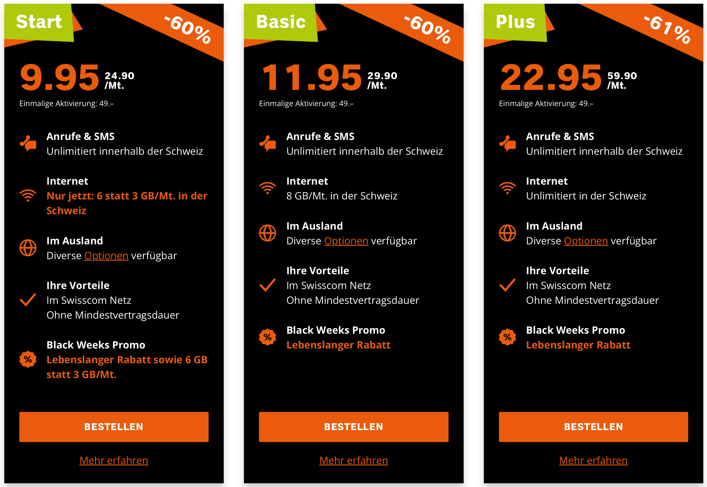 Zum Black Friday 2024 kosten die Coop Mobile Handy-Abos Start CHF 9.95 anstatt 24.90, Basic CHF 11.95 anstatt 29.90 und Plus CHF 22.95 anstatt 59.90. Der Rabatt gilt diesmal lebenslang. Die Mindestvertragsdauer, resp. Kündigungsfrist beträgt 2 Monate.