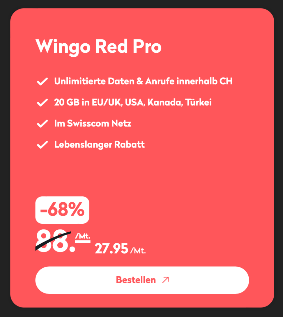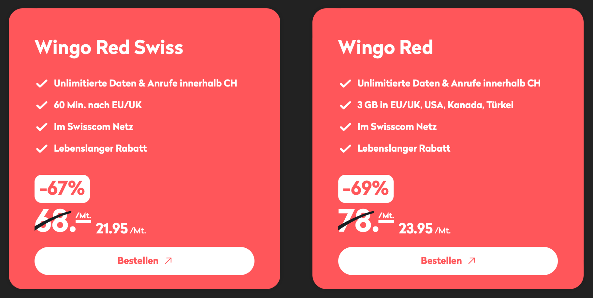 Zum Black Friday 2025 ist das Wingo Handy-Abo «Red Swiss» für CHF 21.95 anstatt 68.-, das «Red» für CHF 23.95 anstatt 78.- und das «Red Pro» zum Aktionspreis von CHF 27.95 anstatt 88.- erhältlich. Dabei gibt es keine Mindestvertragsdauer. Die Kündigungsfrist beträgt 60 Tage, der Aktionsrabatt gilt solange das Abo behalten wird. Hinzu kommt die einmalige Aufschaltgebühr von CHF 59.-.