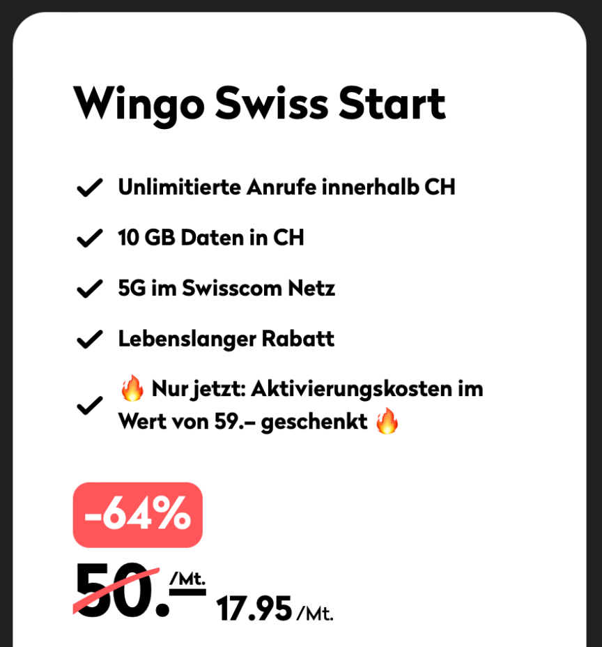 Das Wingo Handy-Abo «Swiss Start» mit unlimitierter Telefonie und 10 GB ist derzeit zum Aktionspreis von CHF 17.95 anstatt 50.- erhältlich. Die Mindestvertragsdauer beträgt 2 Monate, der Aktionsrabatt gilt solange das Abo behalten wird. Die Aufschaltgebühr ist kostenlos.